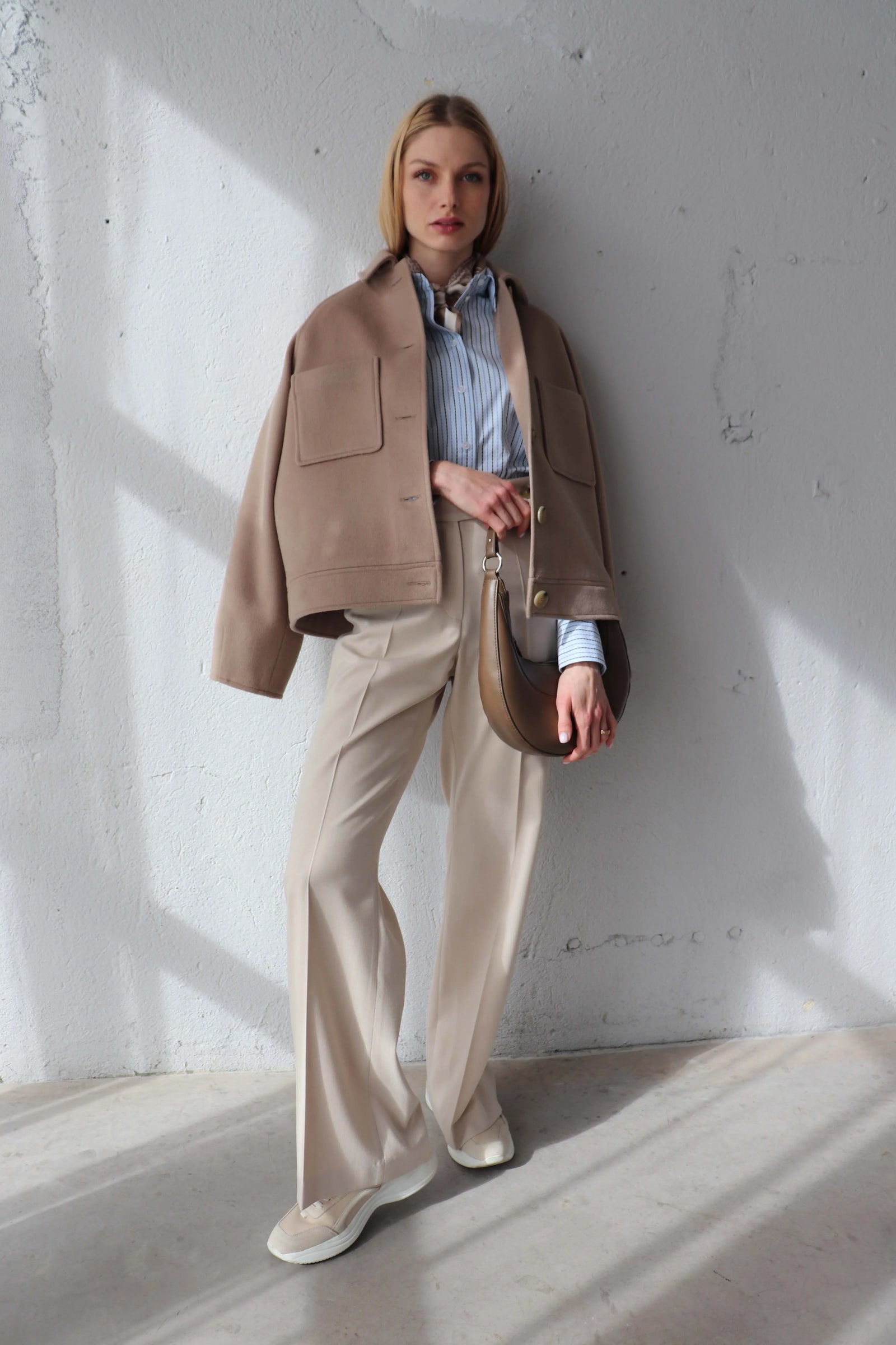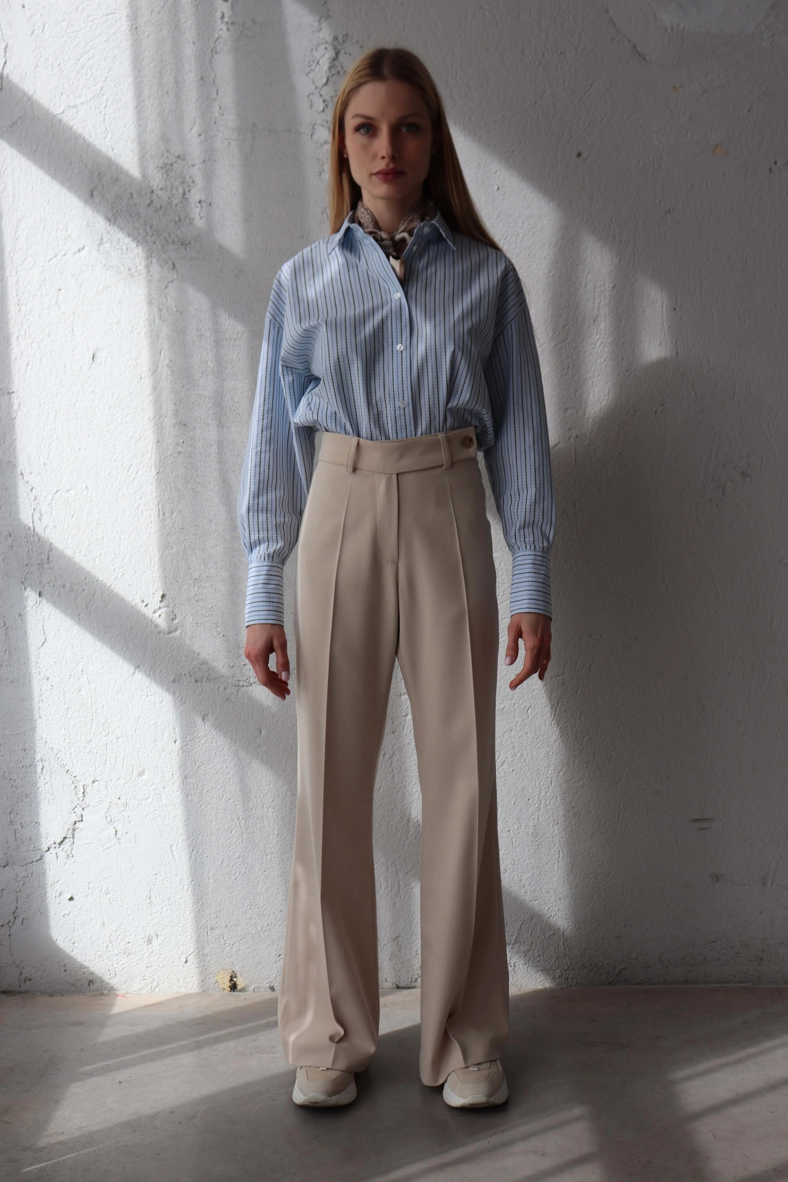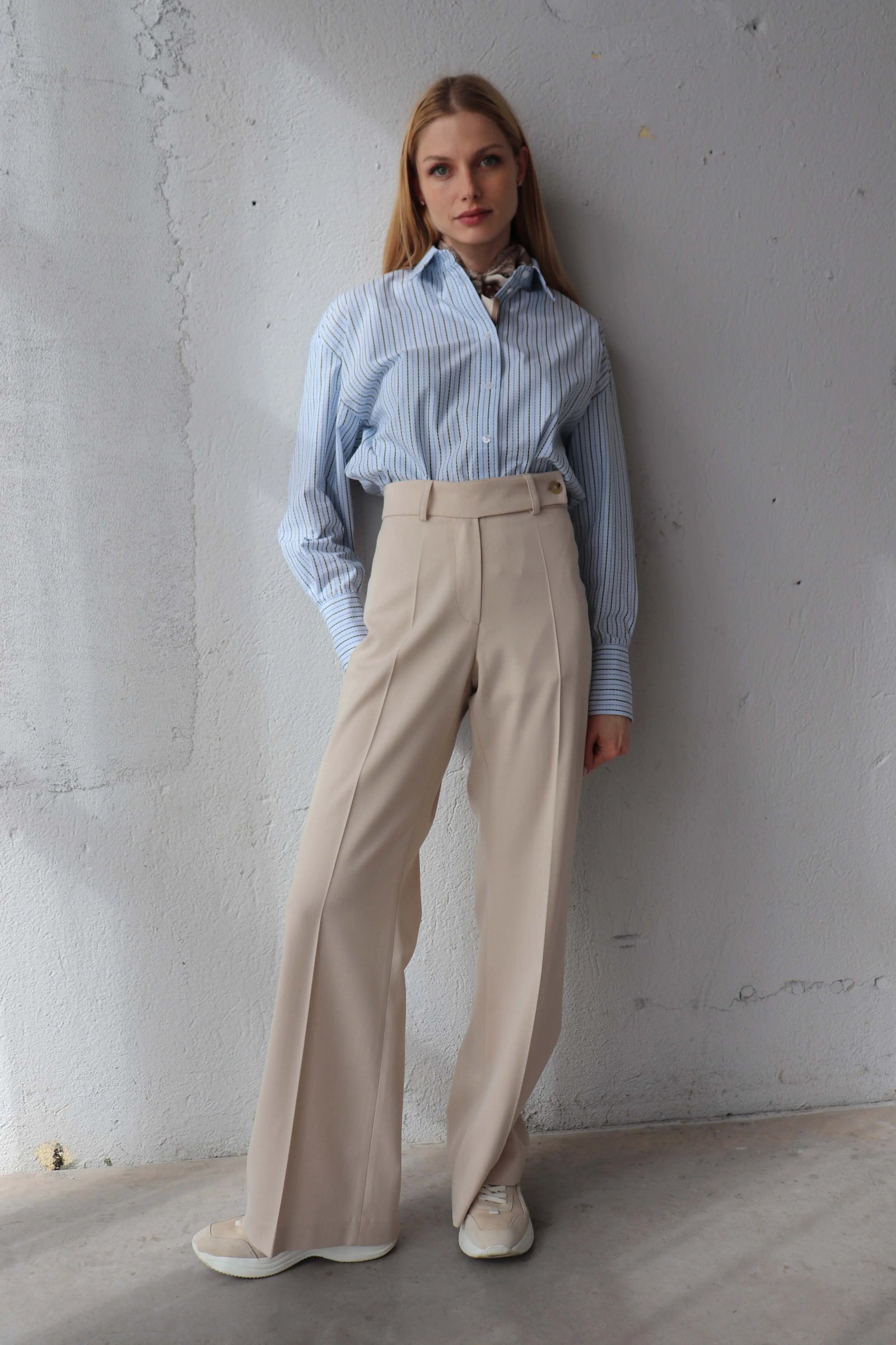 Класически панталон от памук и лиосел. Високата талия и удълженият колан оформят издължен силует. Моделът лесно се вписва в ежедневния гардероб, като осигурява комфорт и мекота.