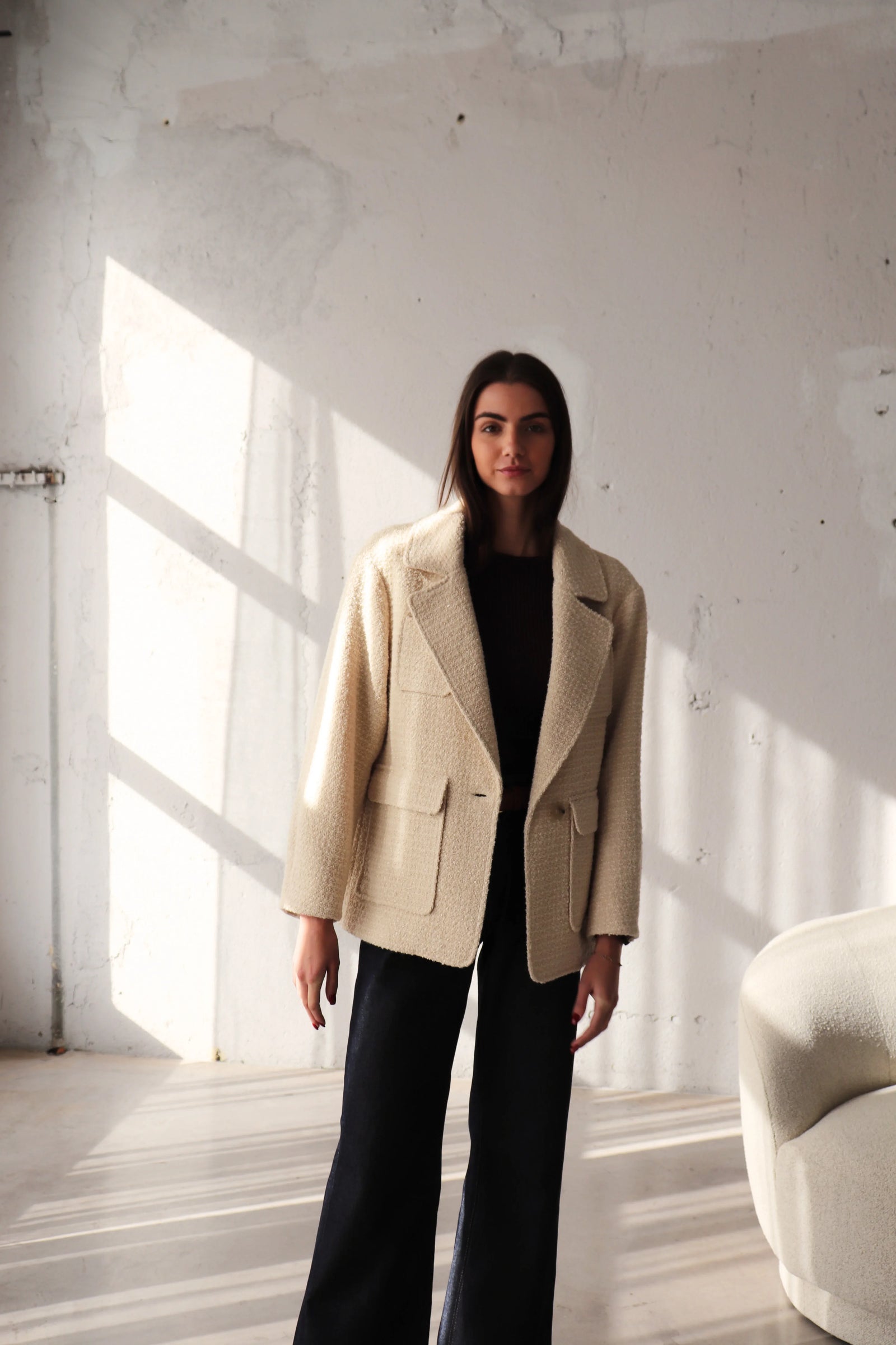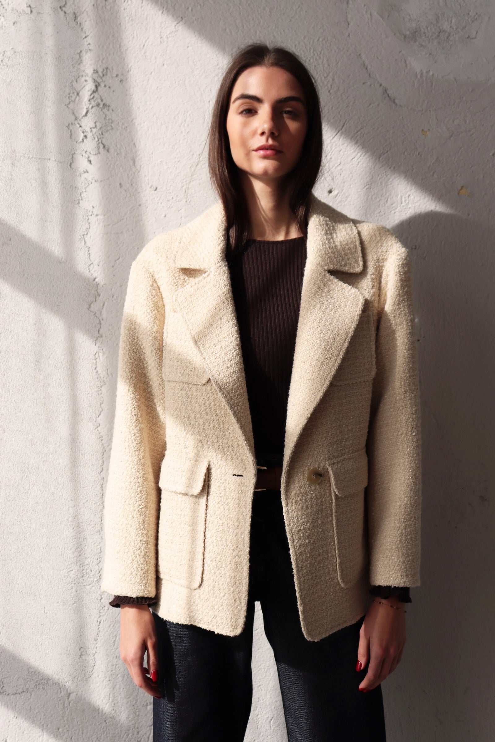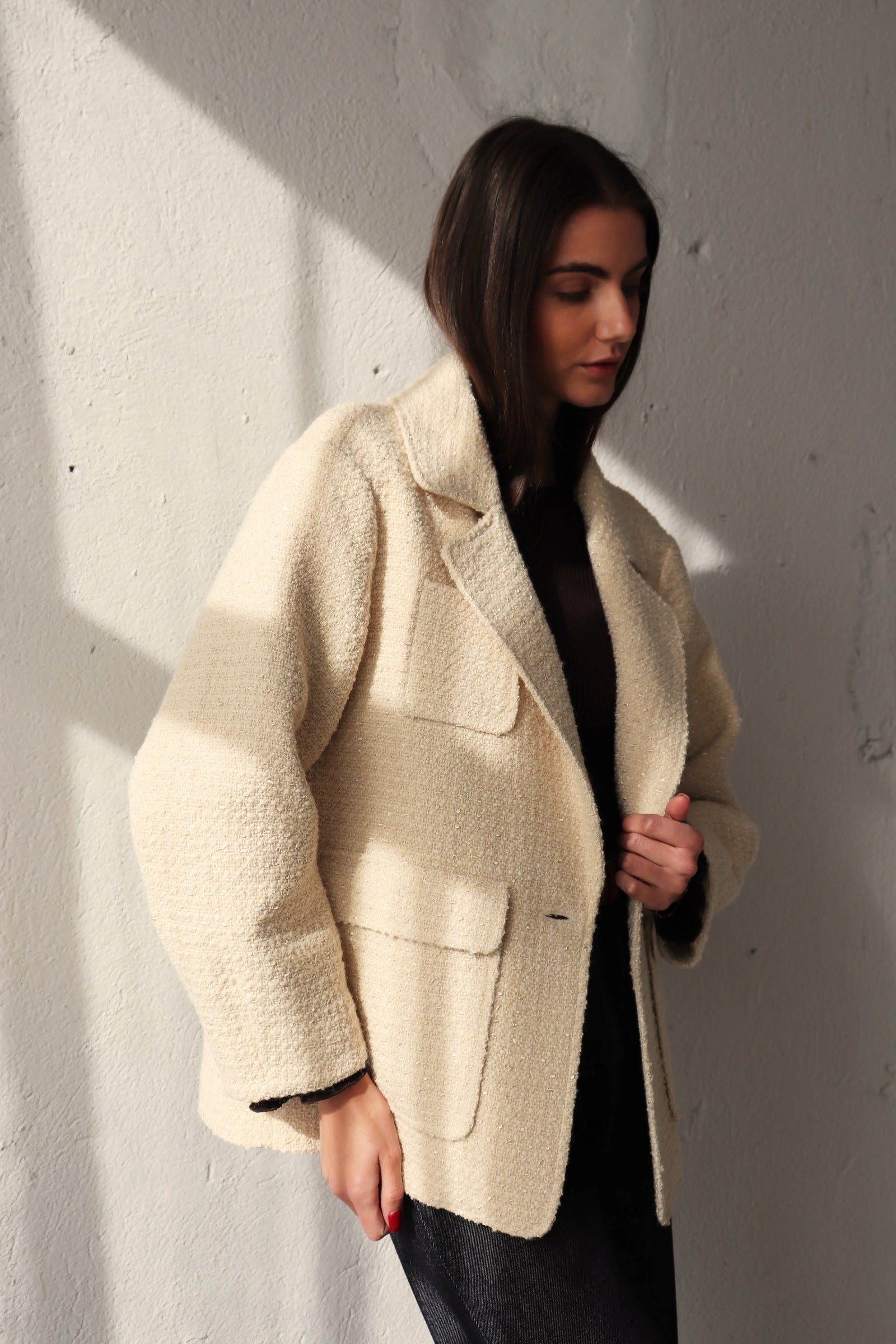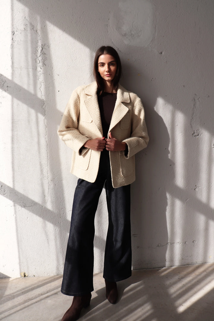 Свободен блейзър от букле в цвят екрю. За този модел избрахме релефна материя с вплетени нишки, които придават характер и дълбочина на текстурата. Благодарение на елегантния, прецизно оформен силует, блейзърът лесно се вписва в ежедневния гардероб, като може да се носи по време на празниците и след тях. Вълнените влакна могат леко да боцкат, затова добавихме подплата за повече комфорт.