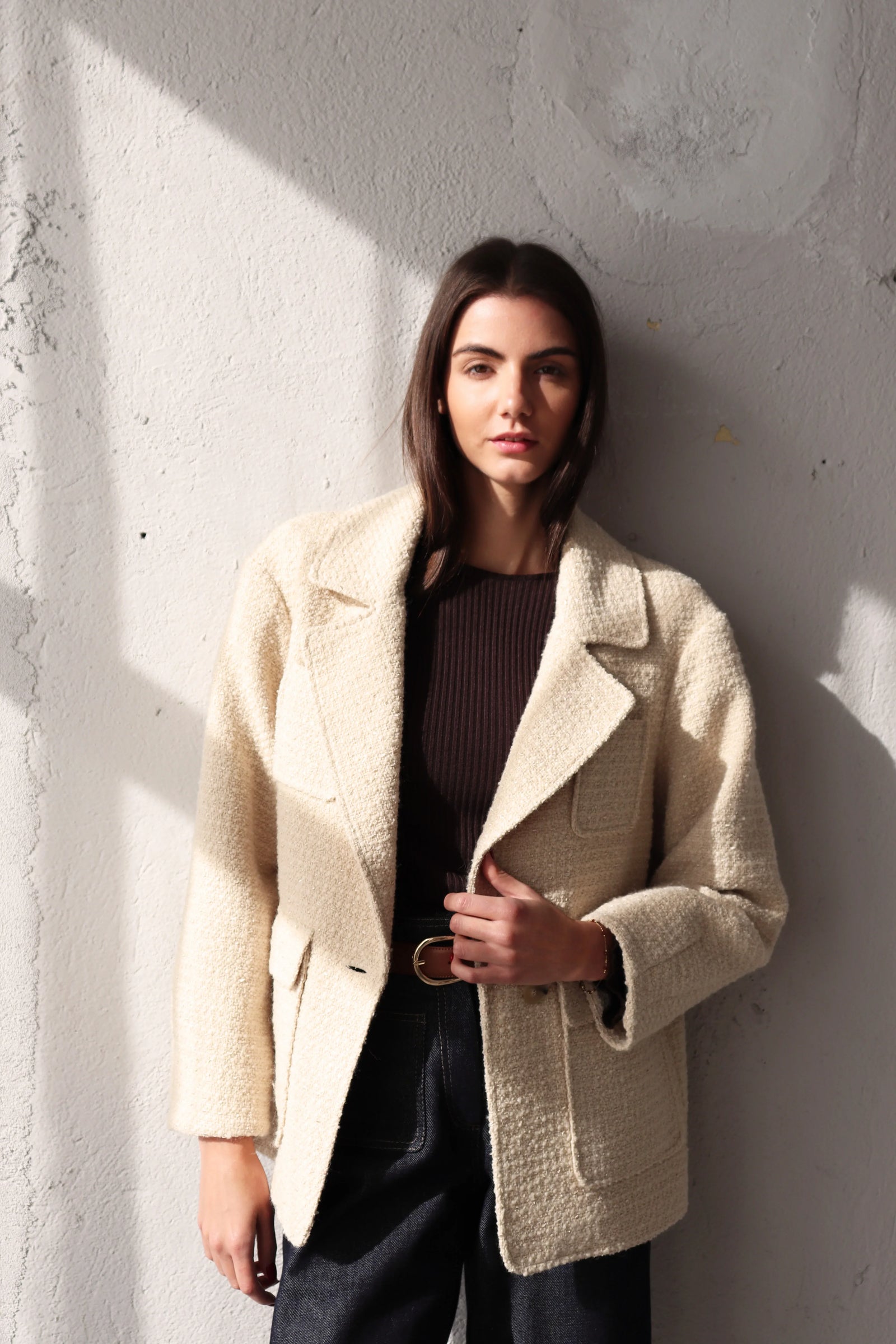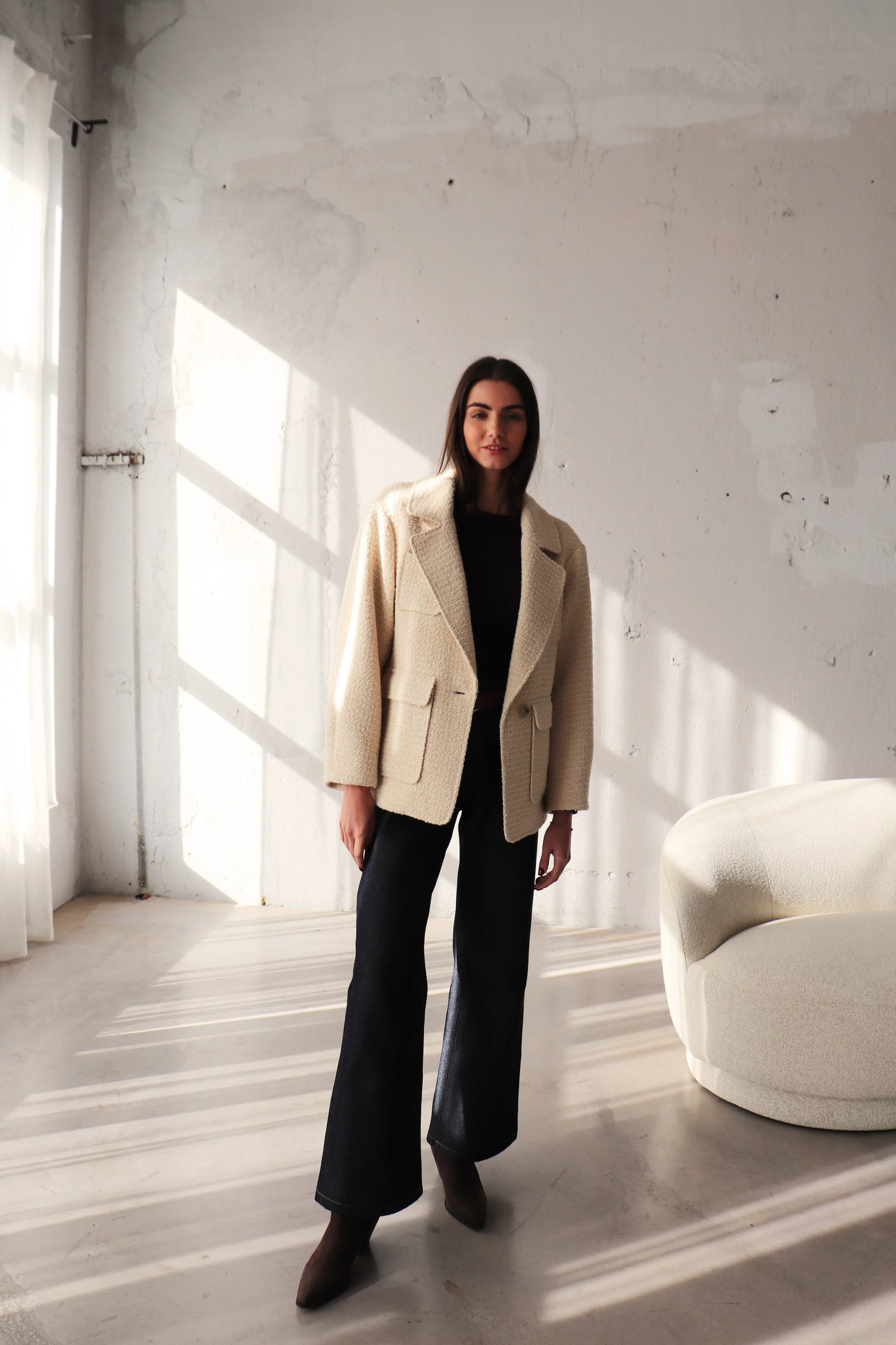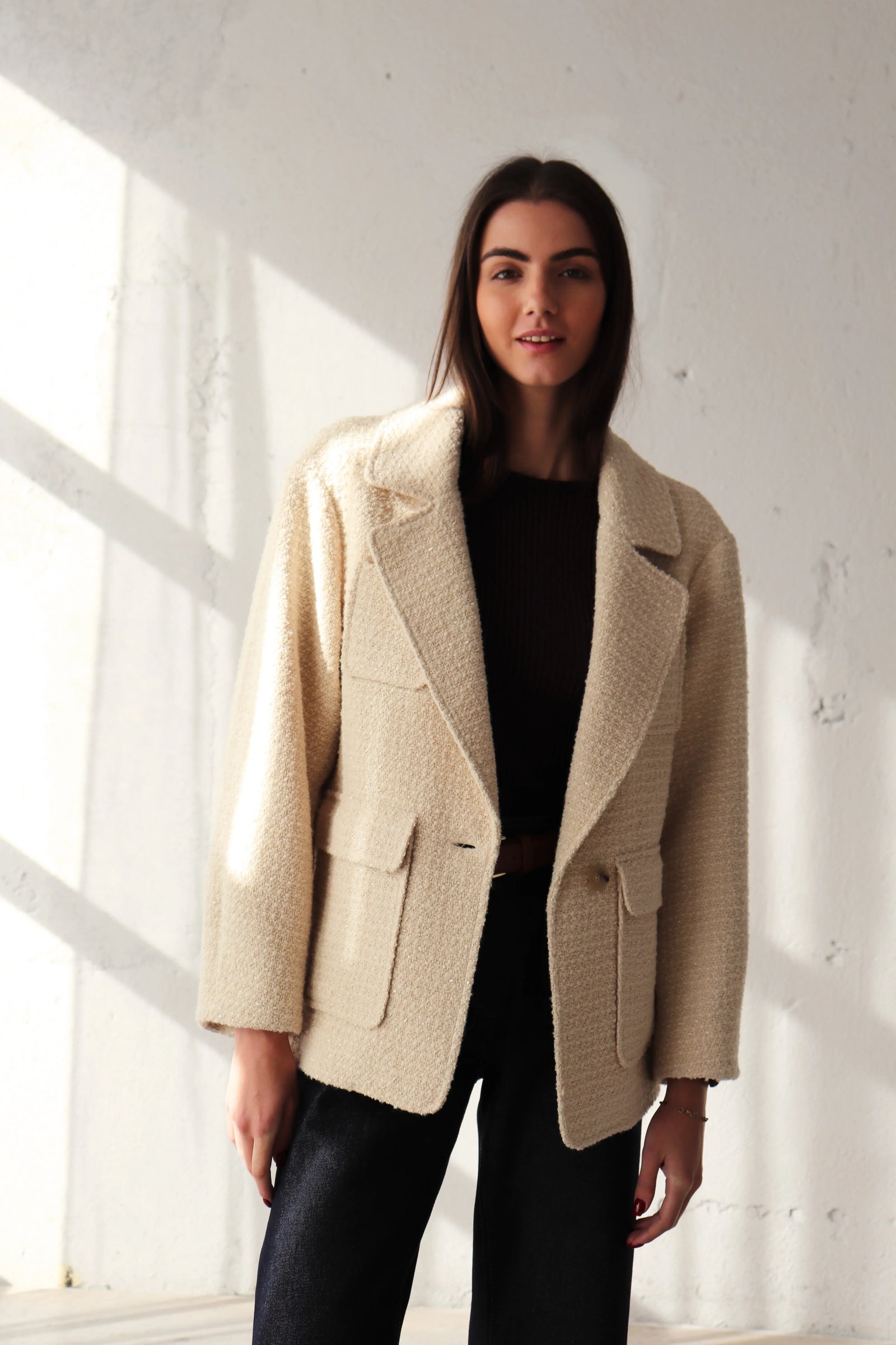 Свободен блейзър от букле в цвят екрю. За този модел избрахме релефна материя с вплетени нишки, които придават характер и дълбочина на текстурата. Благодарение на елегантния, прецизно оформен силует, блейзърът лесно се вписва в ежедневния гардероб, като може да се носи по време на празниците и след тях. Вълнените влакна могат леко да боцкат, затова добавихме подплата за повече комфорт.
