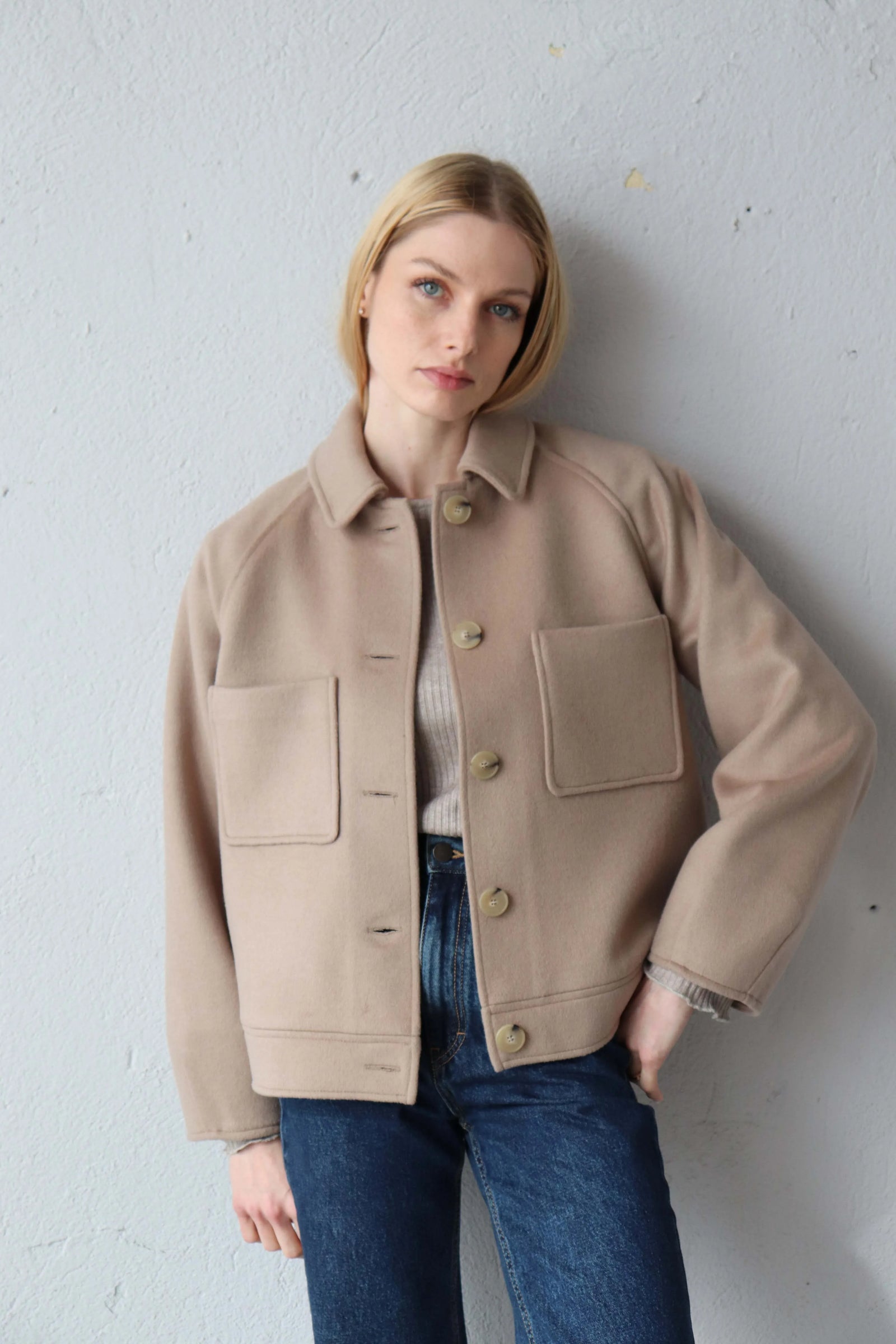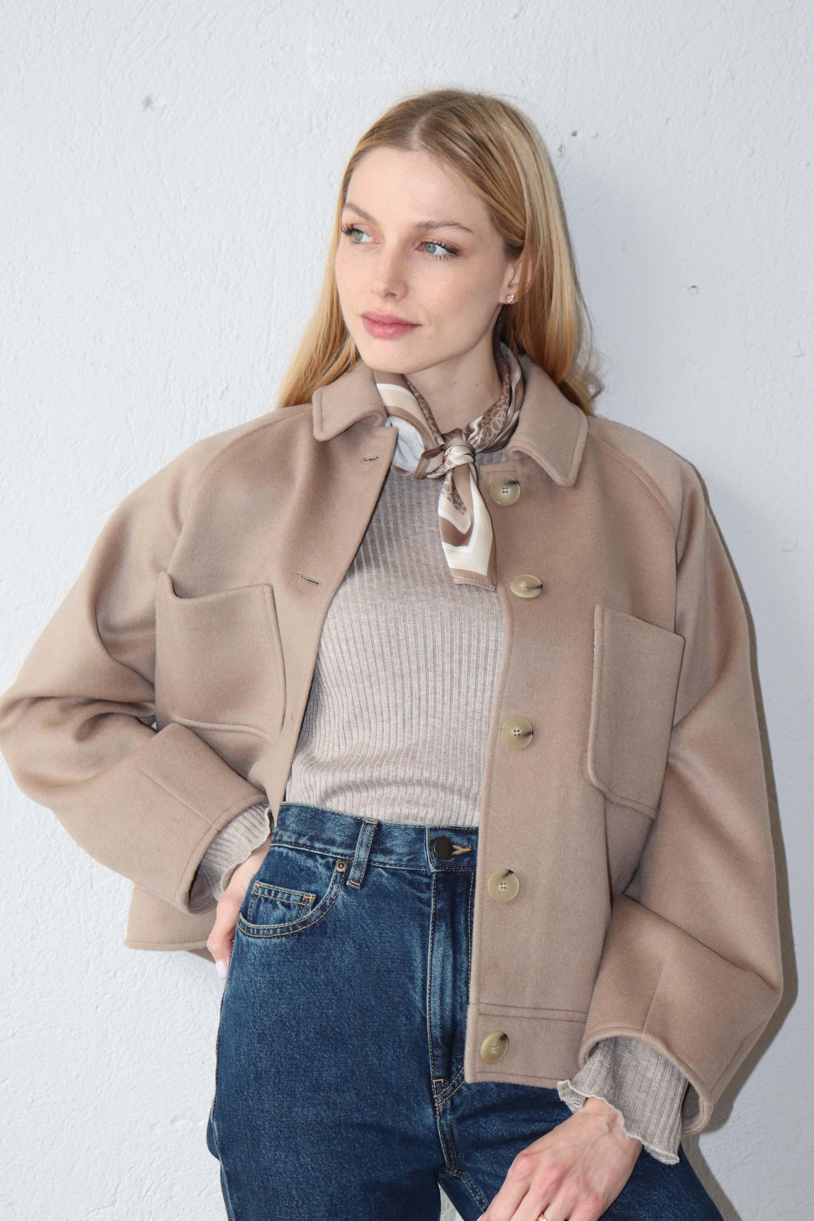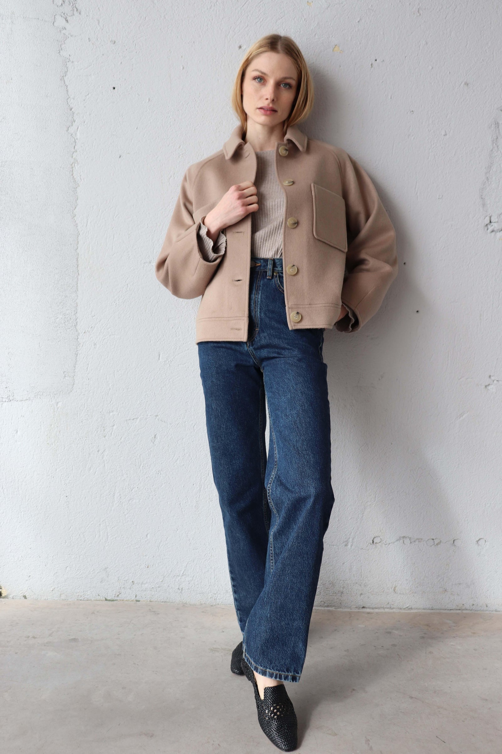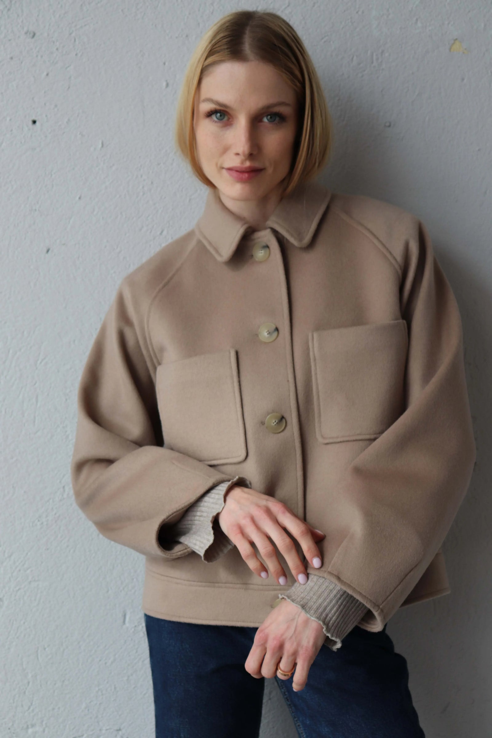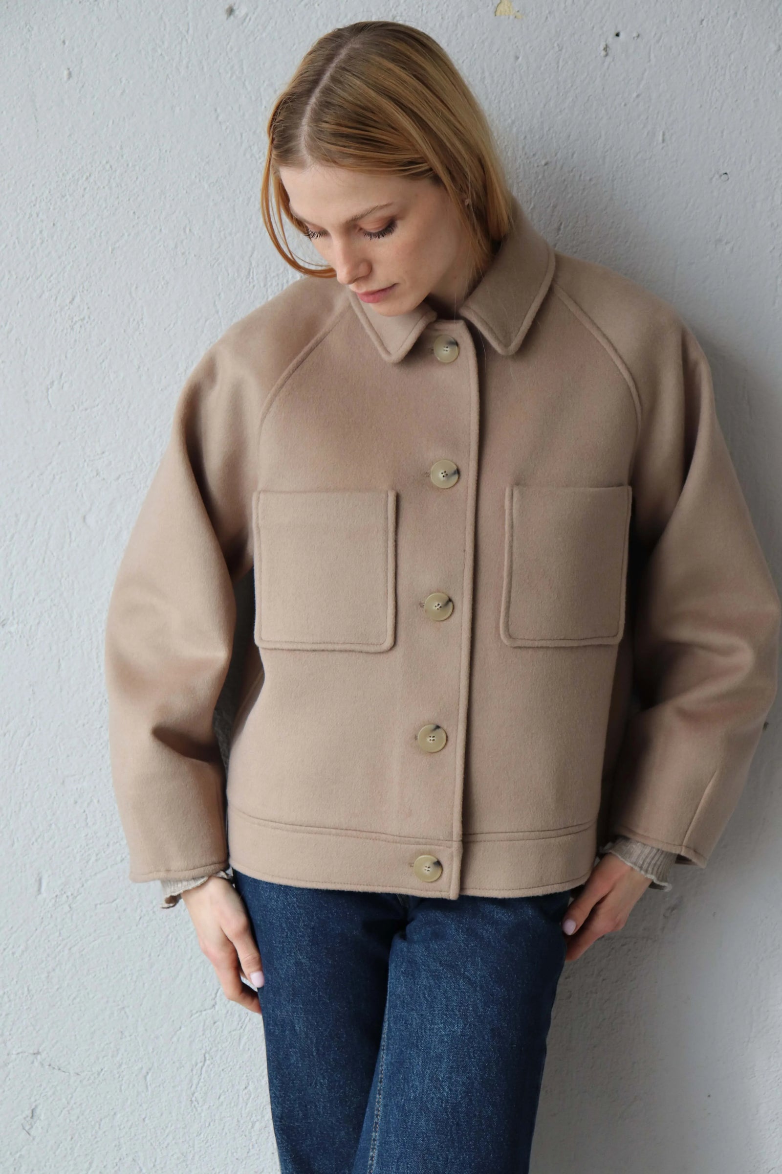 Леко свободната кройка оформя фигурата балансирано, а класическата яка и ръкавите реглан създават уверен и непринуден силует.
