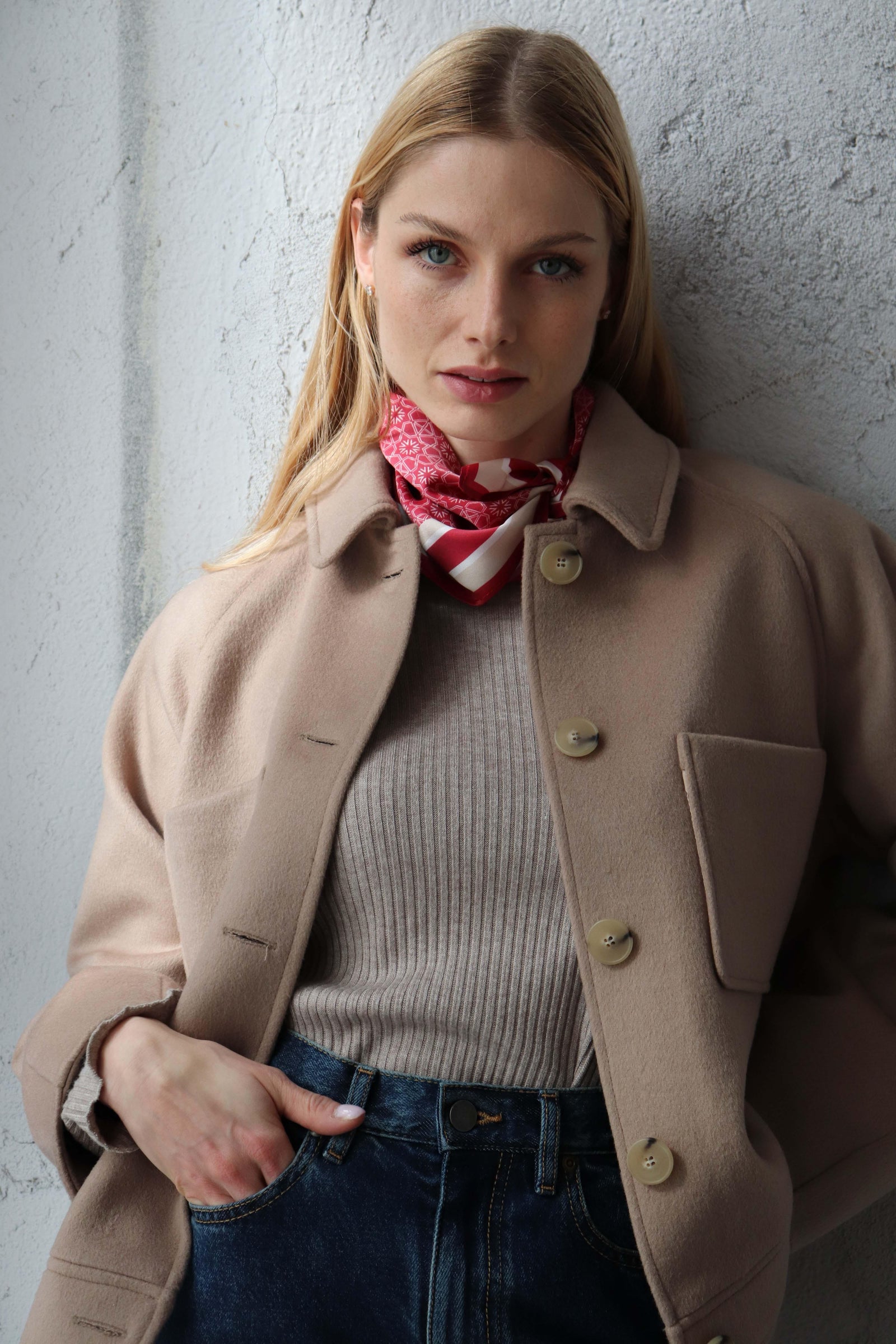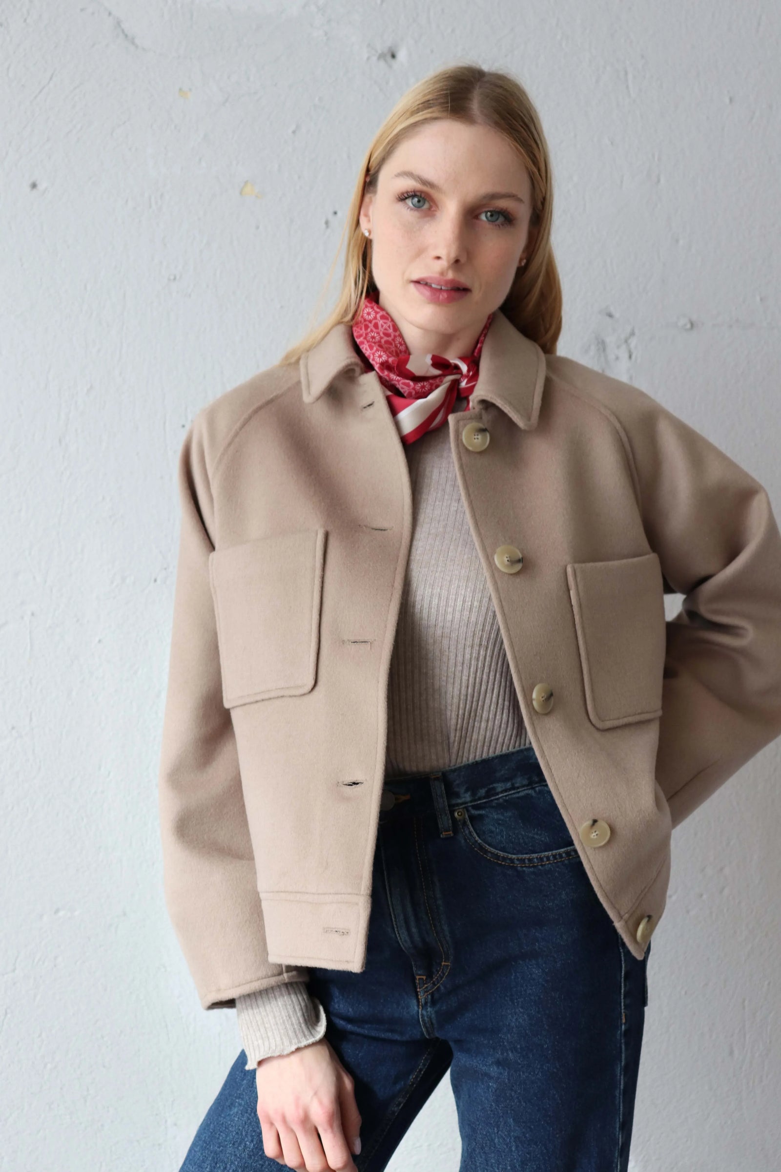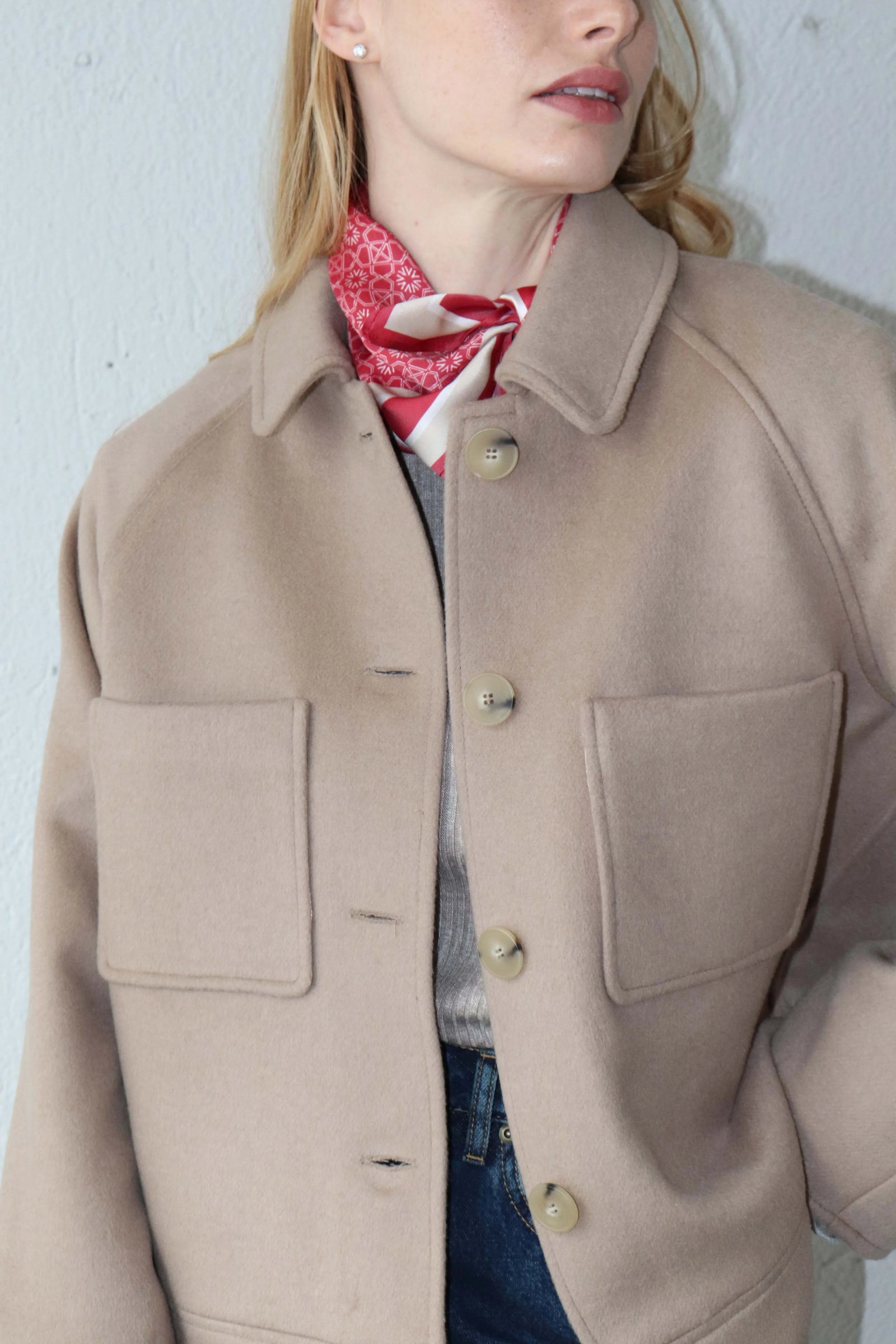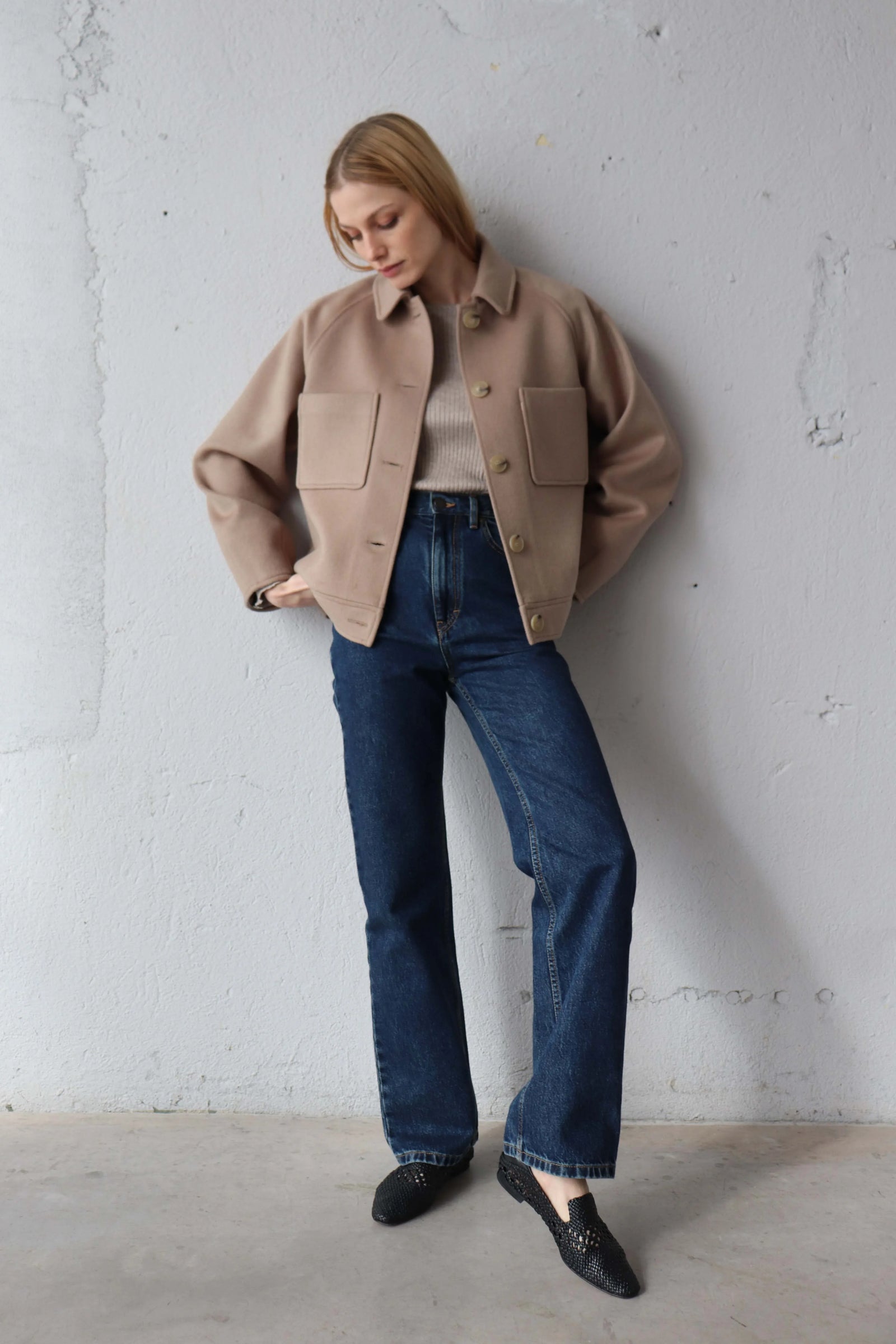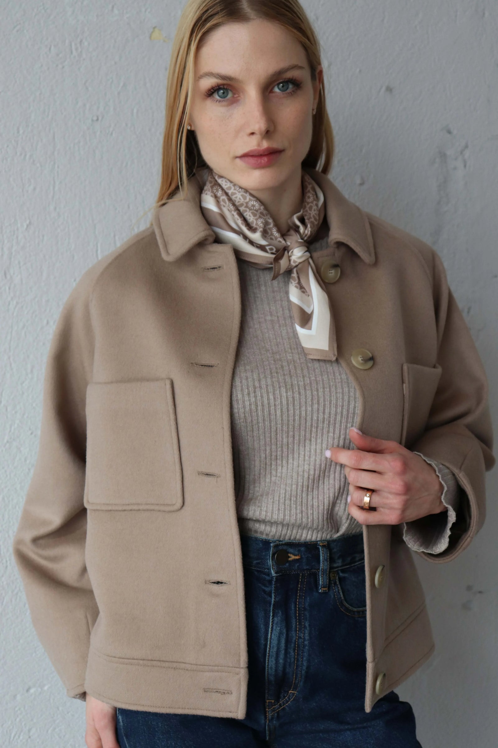 Леко свободната кройка оформя фигурата балансирано, а класическата яка и ръкавите реглан създават уверен и непринуден силует.