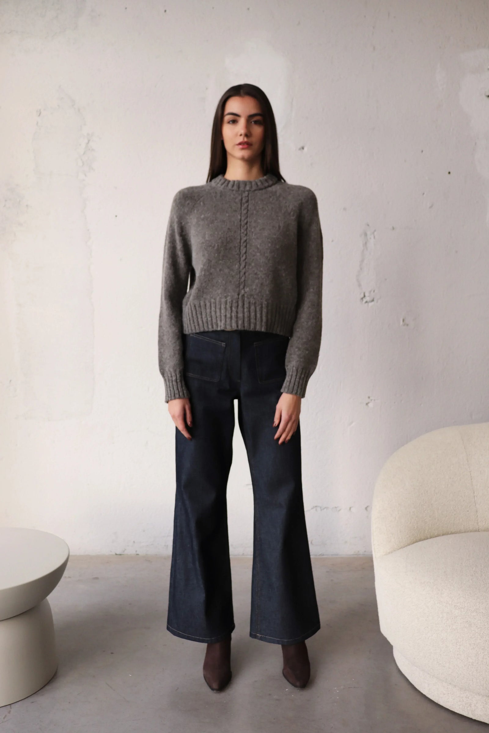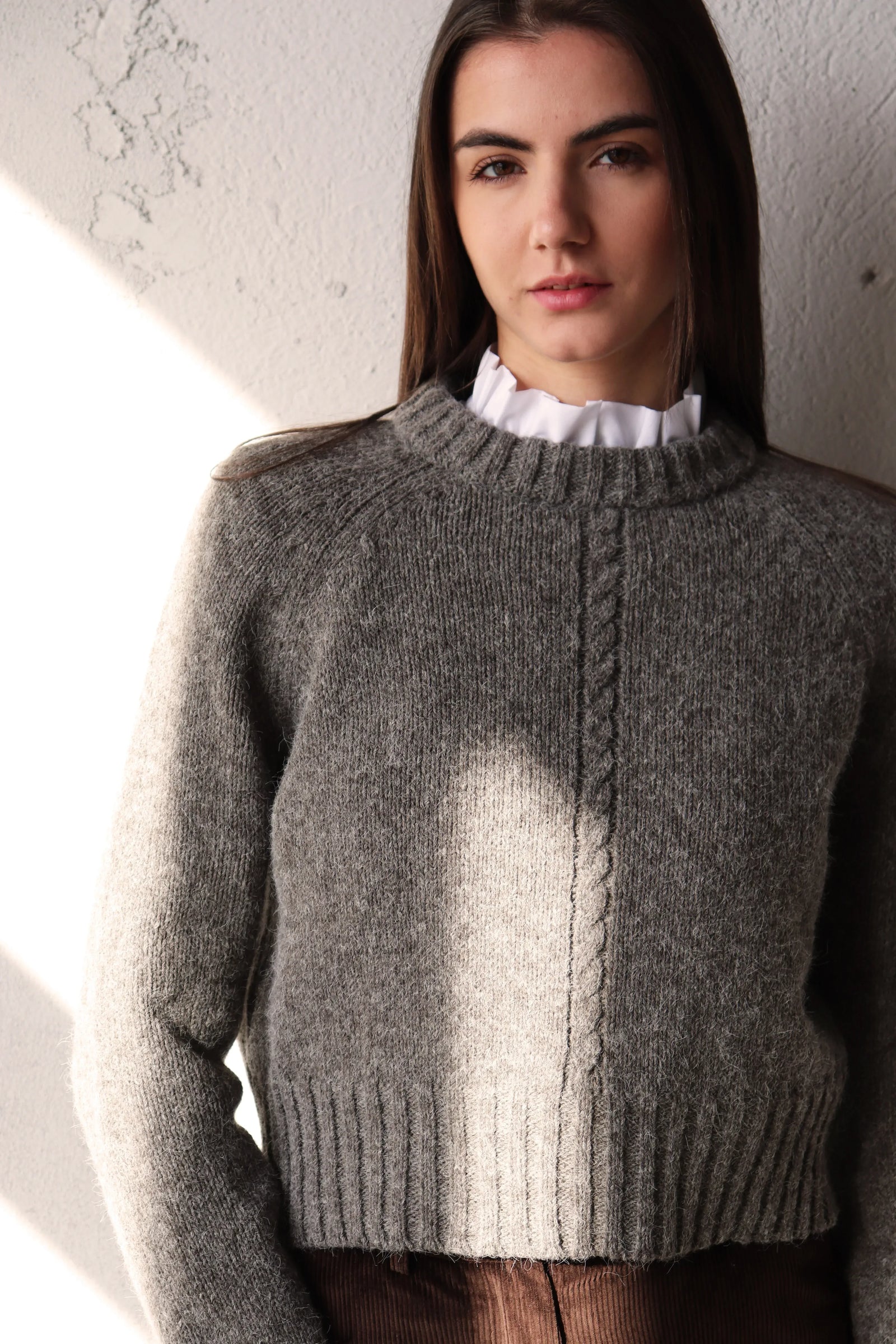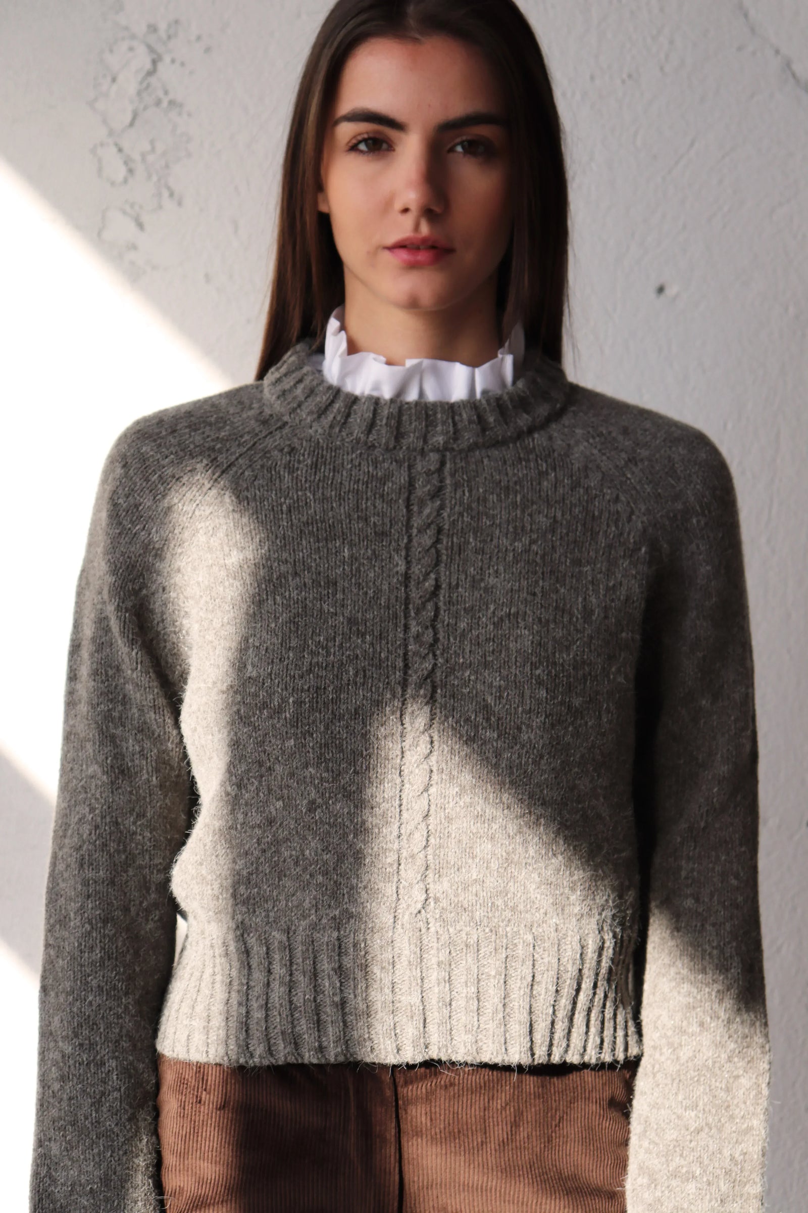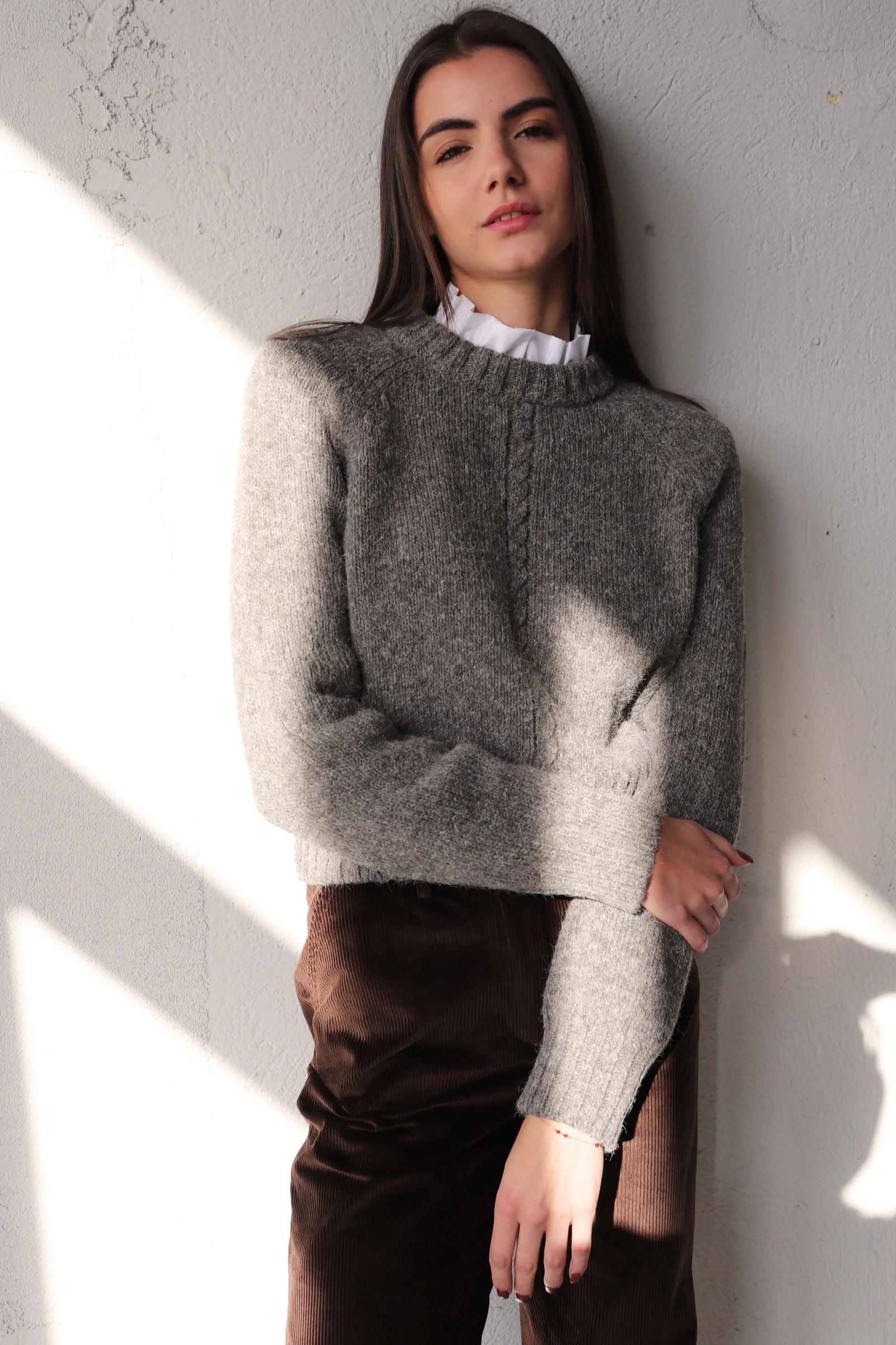 Прав пуловер със свободна кройка и мека линия на рамото — по-вечен от всякога. Удобен за носене върху риза, рокля или тънка блуза.