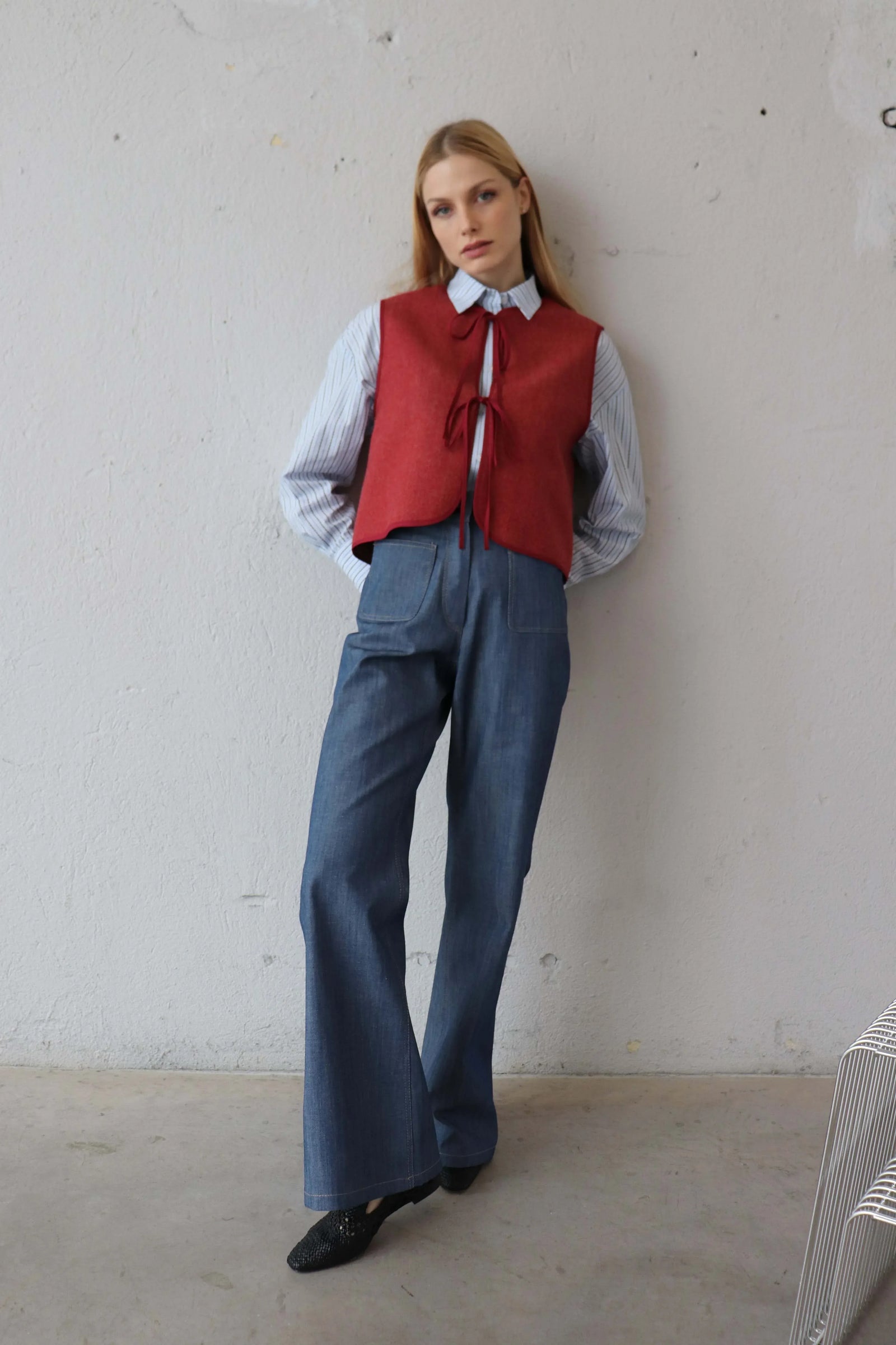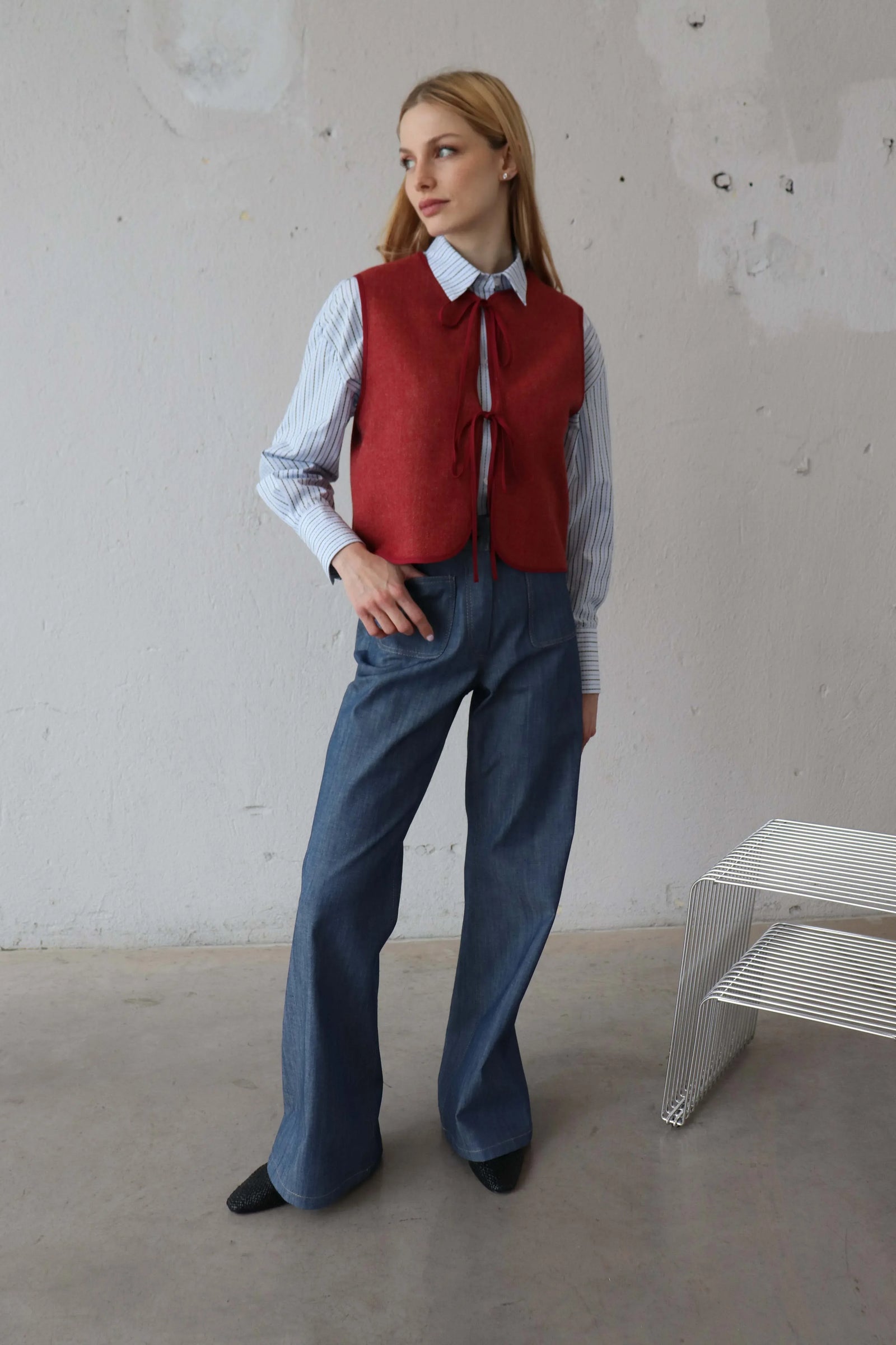 Изработено изцяло от естествена сурова вълна — лека и с приятна текстура. Силуетът е съвременен и изчистен, създаден за лесно комбиниране в ежедневието. Стои еднакво добре с тънко плетиво, риза, тениска и дънки или панталон.