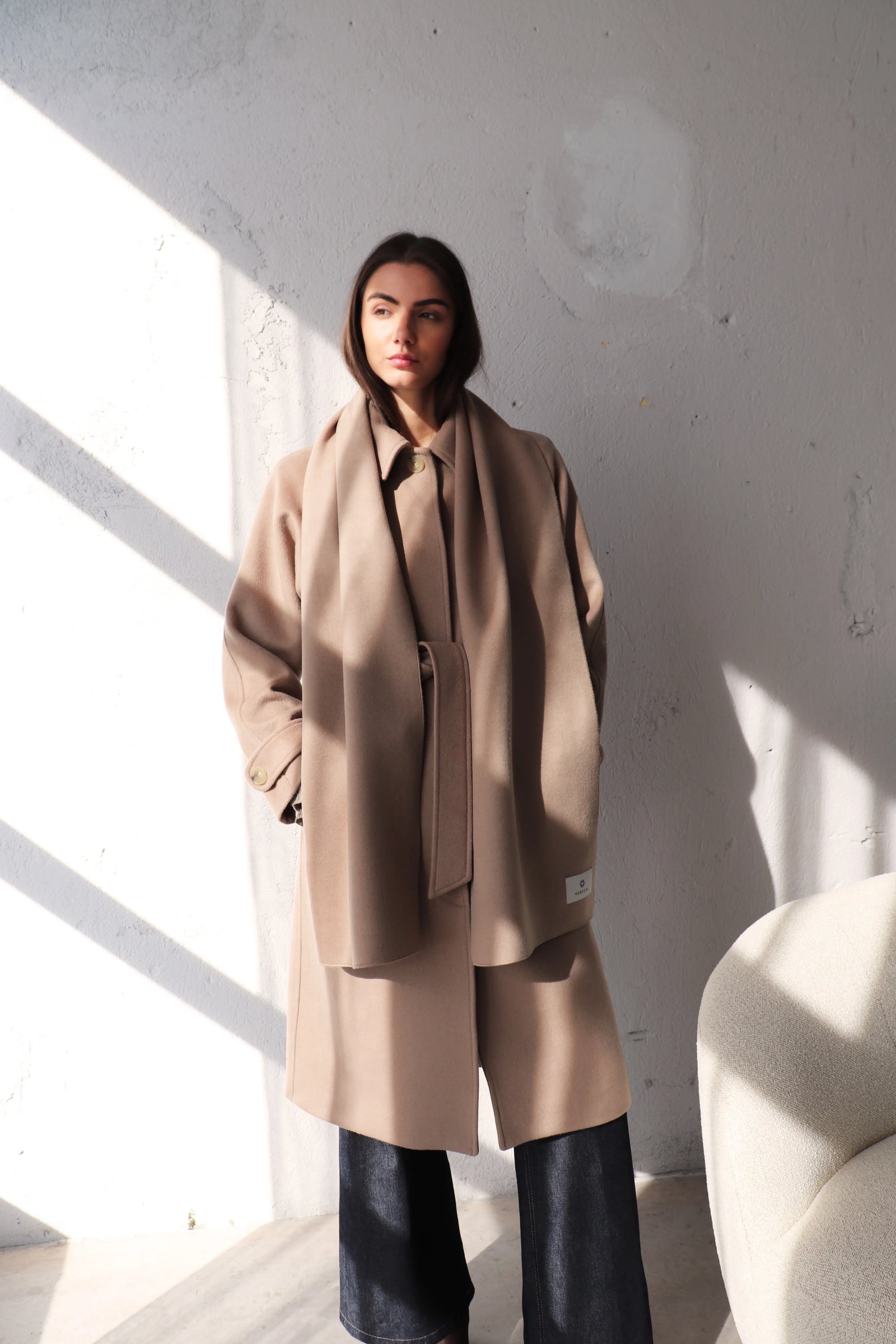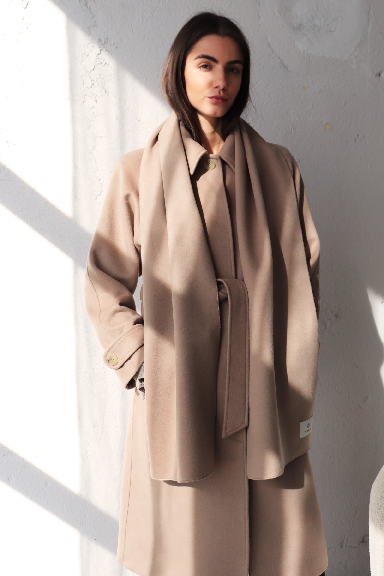 Изчистен, широк и достатъчно дълъг шал (190 x 32 см) от топла смес от вълна и кашмир.